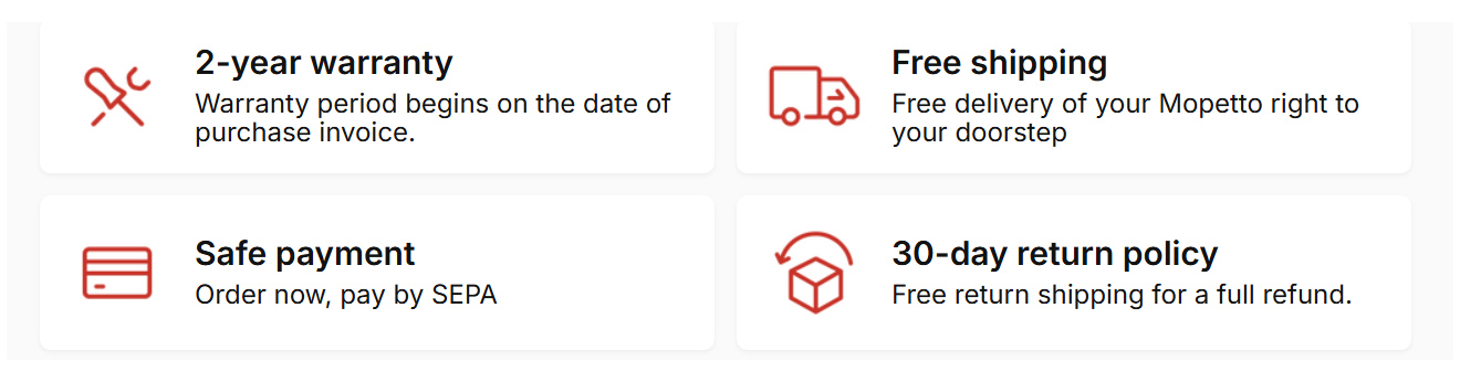 Buy a mopetto and we will deliver to your doorstep for you to test in the comfort of your own neighbourhood. There is full technical support available from mopetto for any questions during setup and use of the mopetto. If you don’t believe mopetto is the right moped for you, you can return it within 30 days – subject to our home test ride terms and conditions. Test Ride At Home is currently available only in: PL/AT/SLO/DE/CRO/HU.